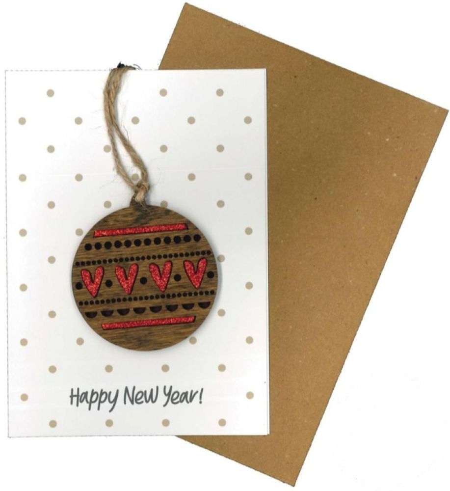 Κάρτα ευχετήρια χειροποίητη δίπτυχη 12x16 cm Happy New Year ξύλινη χριστουγεννιάτικη μπάλα