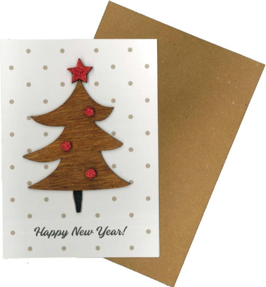 Κάρτα ευχετήρια χειροποίητη δίπτυχη 12x16 cm Happy New Year ξύλινο χριστουγεννιάτικο έλατο