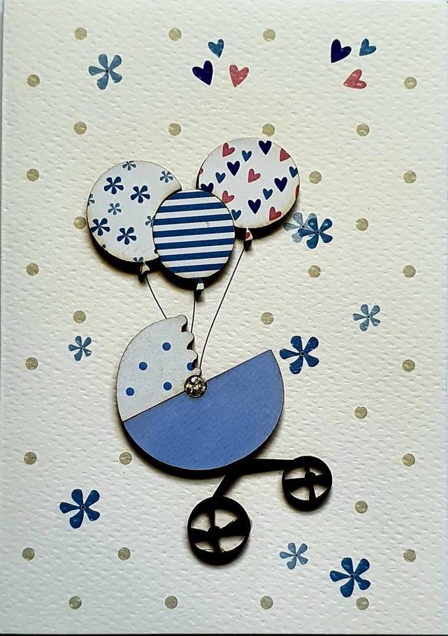 Κάρτα ευχετήρια χειροποίητη δίπτυχη 12x16 cm μπλε καρότσι με μπαλόνια
