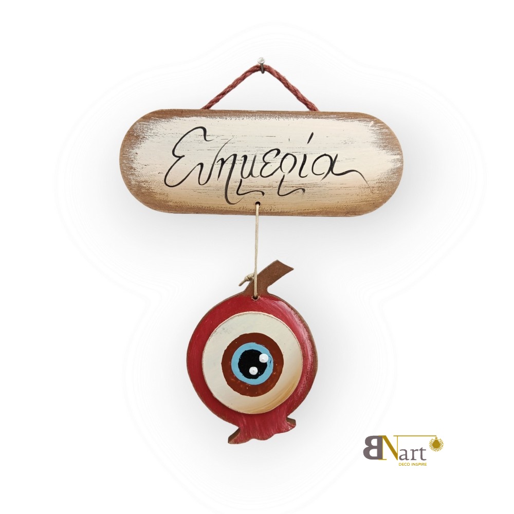 Επιτοίχιο ταμπελάκι με κρεμαστό ρόδι και μήνυμα “Ευημερία”.