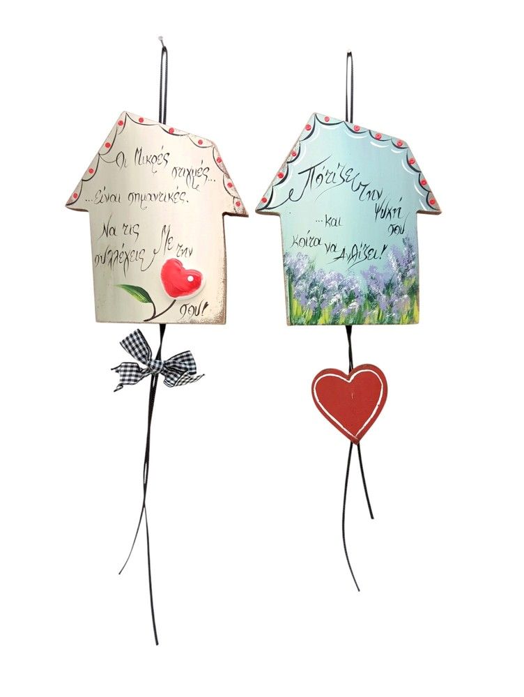 Επιτοίχιο ξύλινο σετ των 2 σε σχήμα σπιτάκι με καρδούλες, μήνυμα " Οι μικρές στιγμες.." 14x12 cm