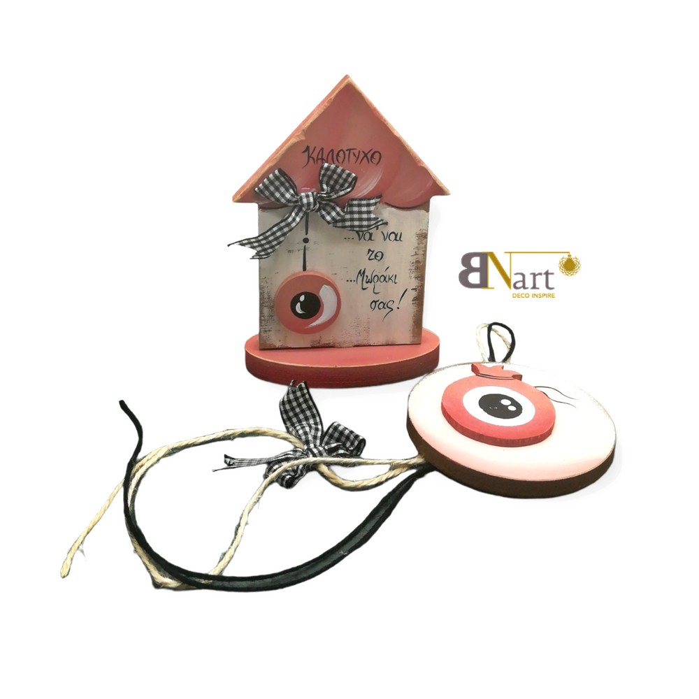 Επιτραπέζιο σετ σπιτάκι για νεογέννητο με ξύλινο στοιχείο ματάκι και υφασμάτινο φιόγκο & στρόγγυλο γούρι 14 x10 cm