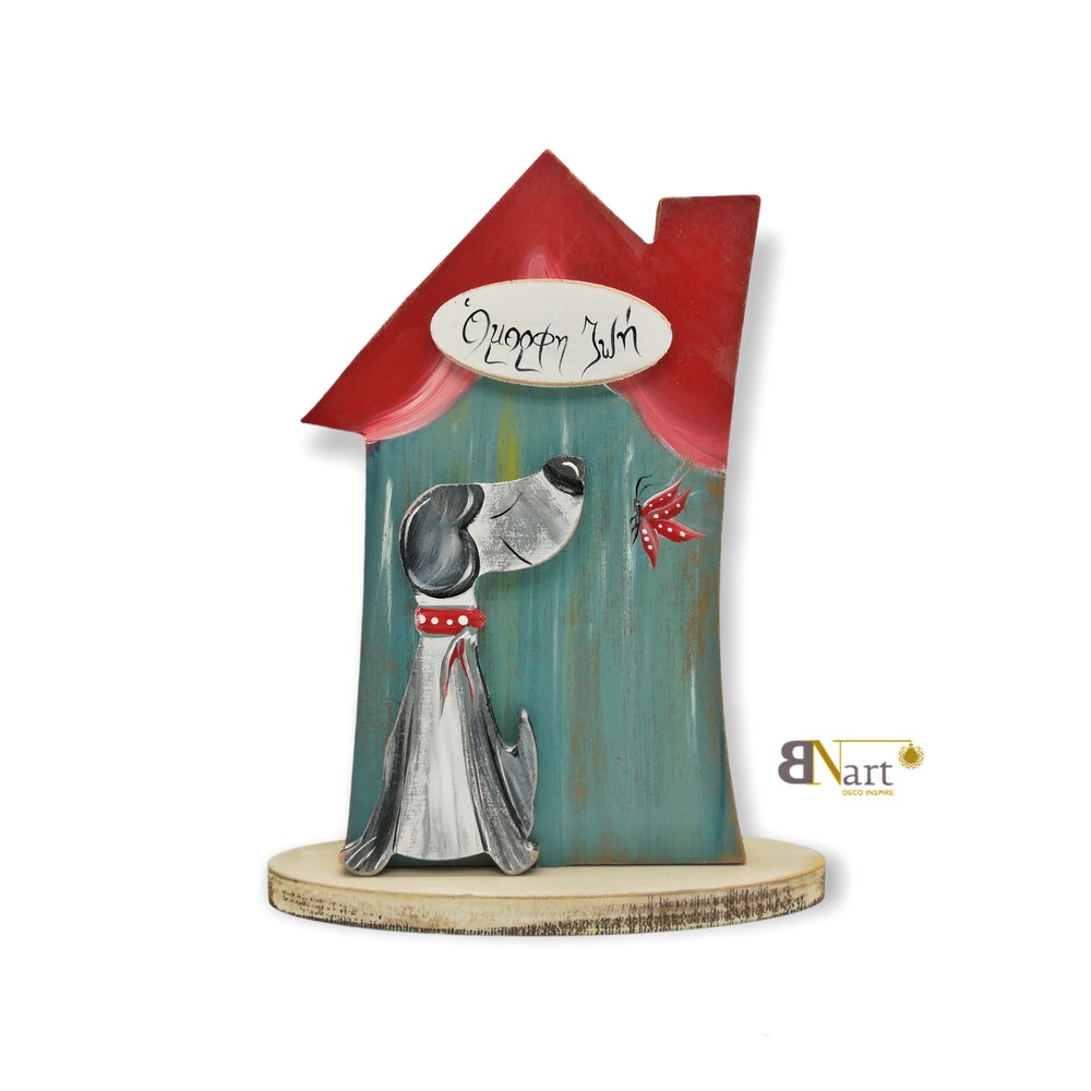 Επιτραπέζιο σπιτάκι με στοιχείο σκυλάκι . Μήνυμα “όμορφη ζωή” 22x18 cm
