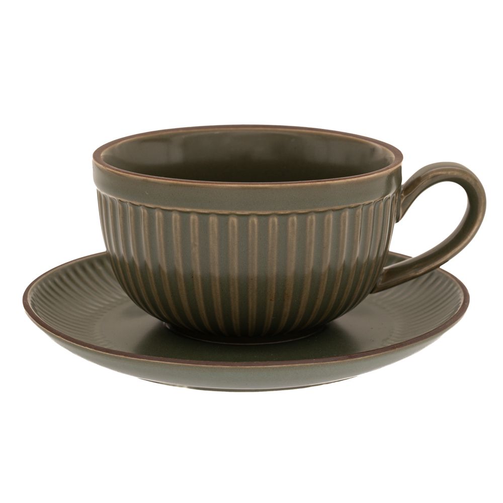 Κούπα κεραμική με ανάγλυφες ρίγες και πιατάκι πράσινο