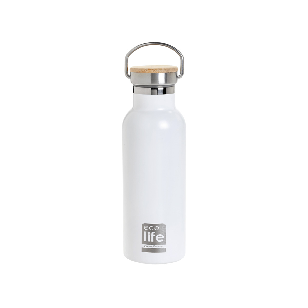 Μπουκάλι θερμός ανοξείδωτο Ecolife - 500 ml με καπάκι bamboo και χερούλι - λευκό