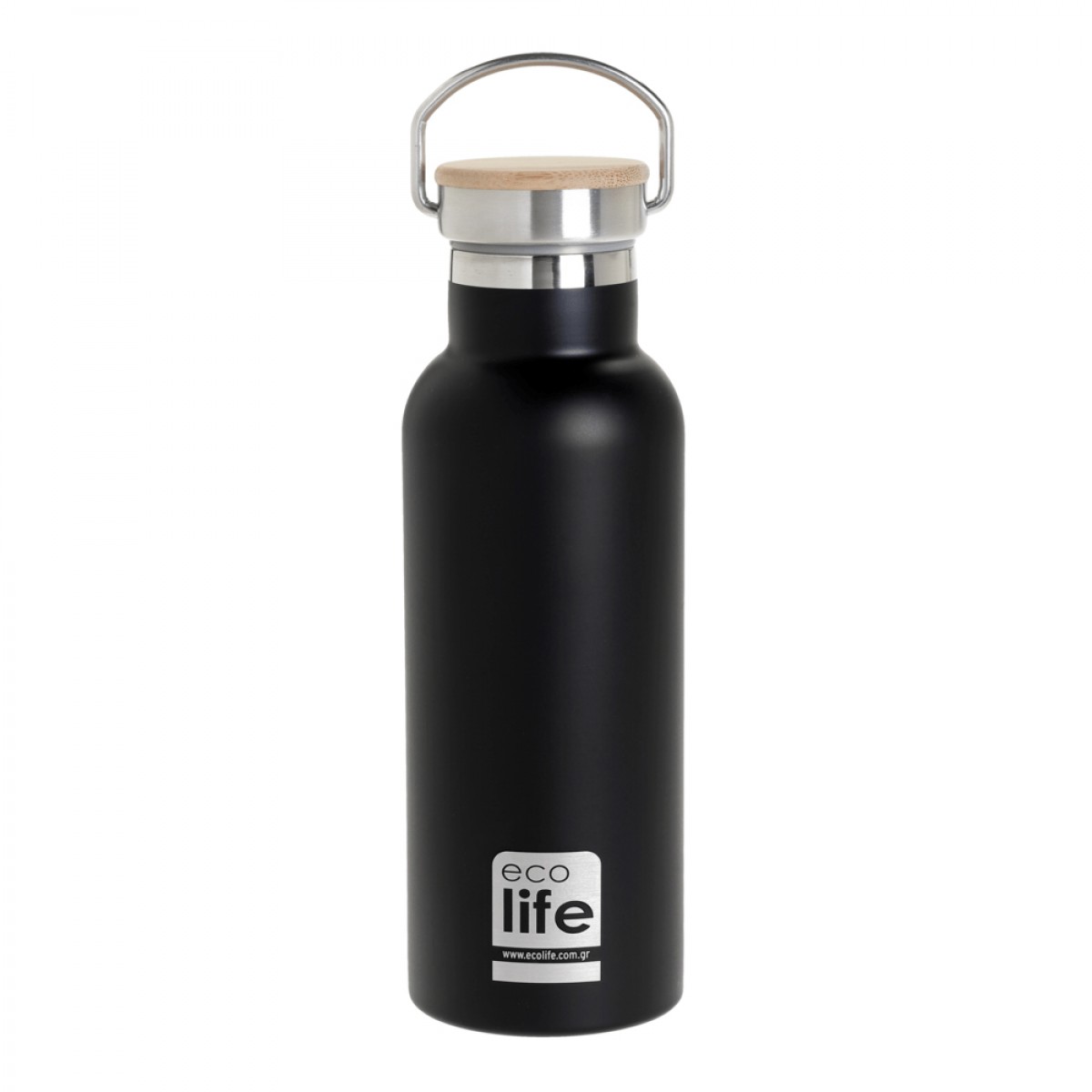 Μπουκάλι θερμός ανοξείδωτο Ecolife - 500 ml με καπάκι bamboo και χερούλι - Μαύρο